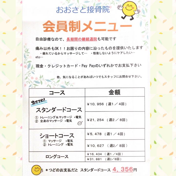当院では、慢性的な肩凝り、腰痛や、全身の疲れ、スポーツ前後のケアなどを、健康保険を使わない『自由診療』にてマッサージやエクササイ・・・(続きはこちら)